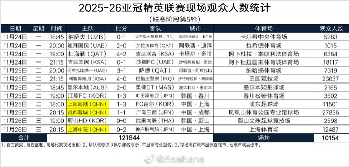 11月28日讯 亚冠精英联赛第五轮结束争夺,上座人数方面,蓉城主场近2.8万人居首,海港、申花主场超1万人。